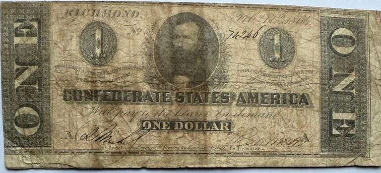 $1 Feb 17 1864 Series CSA Note. T 71. Just honest use and wear. Who knows what story the stains would reveal. Honest use and wear. No pin holes or tears Lower denominations saw lots of use in general.