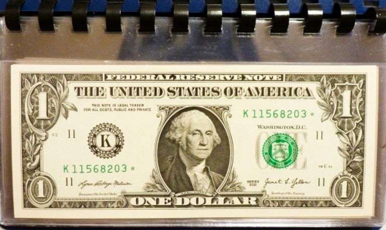 Ten One Dollar 2013 Star Replacement Notes. From The Federal Reserve Bank Of St. Louis. Superb Crisp Examples. Well Centered With Great Margins, Bold Ink, Exceptional Paper Quality, And Consecutive Serial Numbers. Housed In A Ten Page Currency Album!!