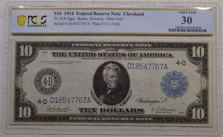 1914 $10 Cleveland Federal Reserve Note Fr. 918 Burke Houston. PCGS Very Fine 30. Offered here is a Series 1914 $10 Federal Reserve Note, cataloged as Fr. 918, issued from the Cleveland Federal Reserve Bank (District D) and bearing the signatures of Burke and Houston. Graded Very Fine 30 by PCGS Banknote, this example displays solid mid-grade eye appeal with moderate circulation consistent with the assigned grade. The note retains strong detail in the central portrait of Andrew Jackson, a clear district seal, and well-defined design elements throughout. Expected fold lines and light handling are present, but margins remain balanced, and paper integrity is intact.