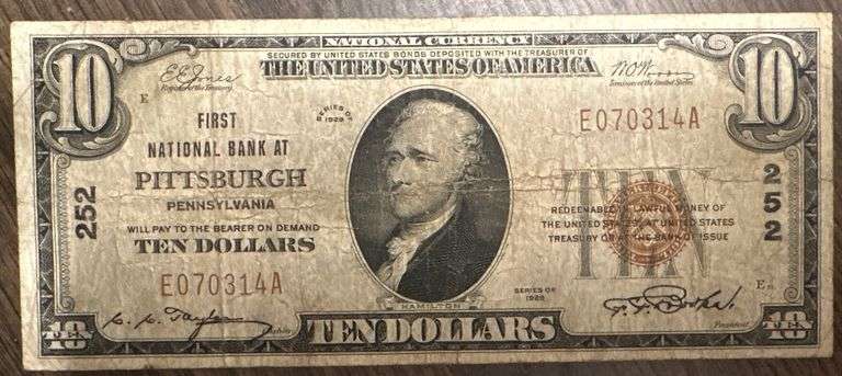 1929 $10 National Bank Note issued by the First National Bank of Pittsburgh, Pennsylvania, Charter No. 252. This is a Type 1 small-size National Bank Note, featuring the classic portrait of Alexander Hamilton on the face and the detailed engraving of the bank building on the reverse. The note displays brown charter numbers, a blue Treasury seal, and matching serial numbers, all consistent with the issue. Charter number “252” is clearly visible at the top and bottom of the face, confirming the Pittsburgh issuance. These notes were produced in limited quantities and remain popular with both national bank collectors and Pennsylvania specialists. Despite its circulation wear, this example retains strong eye appeal, legible details, and solid authenticity. It’s an honest, original note with character, not one of those suspiciously “too clean” miracles.