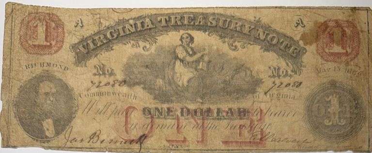 $1 Virginia Treasury Note May 13 1862. Just honest use and wear Poor paper quality.Stain by right one. Decent looking signatures an hand cutting