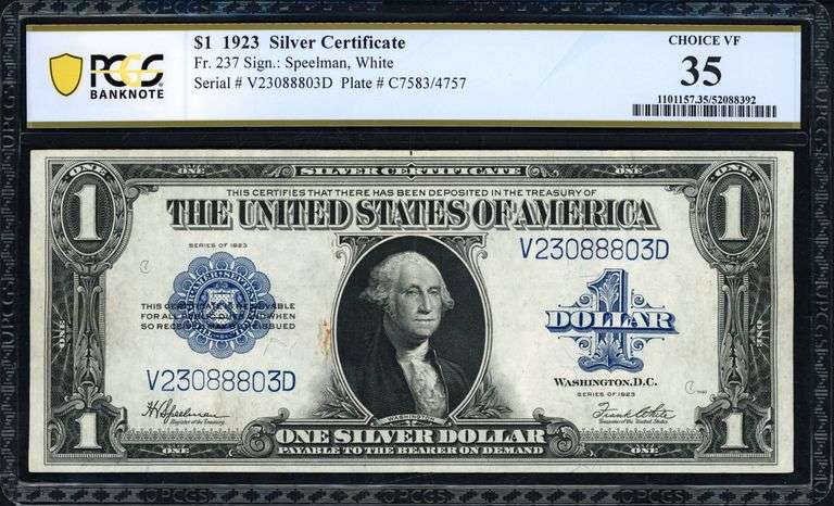 1923 $1 Silver Certificate “Funnyback” Note, cataloged as Fr. 237, and graded Choice Very Fine 35 by PCGS Banknote. This popular large-size type features the distinctive ornate reverse design that collectors nicknamed the “Funnyback.” Issued during the final years of large-size U.S. currency, these notes remain one of the most widely collected early Silver Certificates. The note displays strong mid-grade detail with excellent eye appeal for the grade, including solid paper integrity and well-defined printing. The design elements remain bold, and the note retains pleasing color throughout. Moderate circulation is visible, consistent with the Choice Very Fine 35 grade. Signature combination Speelman / White appears on this desirable large-size issue. A classic type note and an essential addition for collectors of large-size U.S. currency, Silver Certificates, or type sets.