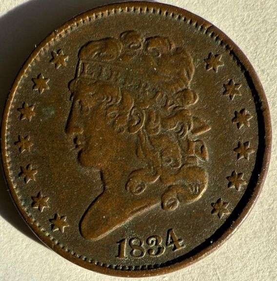 Nice 1834 Half Cent. Good hair and curls. Chocolate brown color. Lots of decent leaves in the wreath. Good planchet.