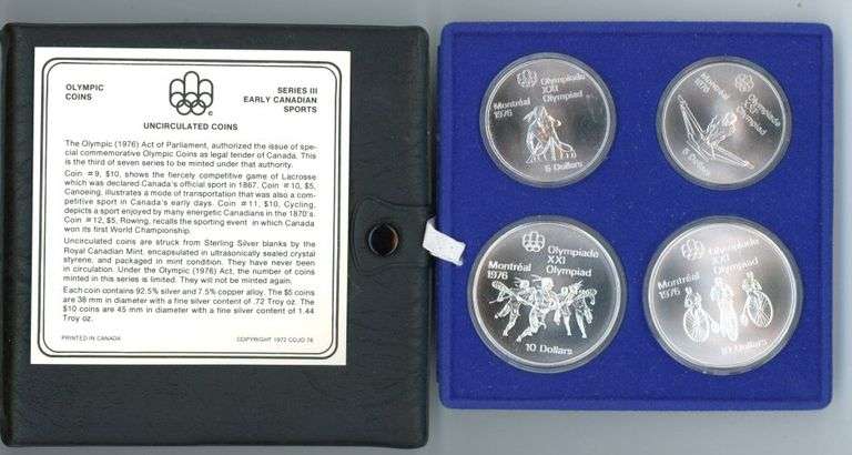 This 4-Piece BU Silver Coin Set contains 2 $10 Silver coins, and 2 $5 Silver coins, all minted by the Royal Canadian Mint to commemorate the Montreal Olympics. Housed in it's original custom box, complete with CoA.