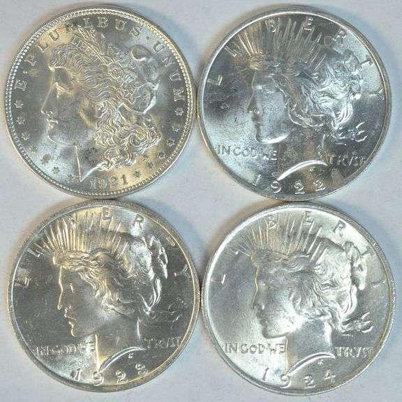 Blazing-white run of 4 diff. nice Brilliant Uncirculated Silver Dollars 1921 (Morgan), 1922, 1923, & 1924 Peace Silver Dollars.