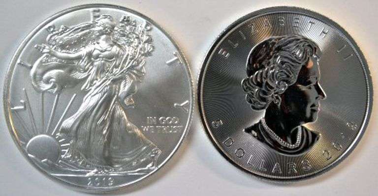 Pair of pristine-perfect 1 Troy Oz pure Silver coins from 2019: $1 American Silver Eagle & $5 Canadian Silver Maple Leaf.