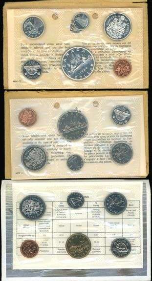 Three diffferent dates of Canadian Proof Sets, all housed in their original envelopes and cellophane. Includes one Silver Proof Set from 1966, one Proof Set from 1968, and one Proof Set from 1995.