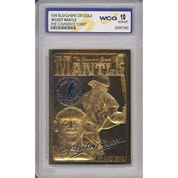 Baseball legend in 23KT Gold collectible card featuring Mickey Mantle, “The Commerce Comet.” Crafted in 23-karat gold foil, this sculpted limited-edition card is individually serial-numbered and officially graded GEM MINT 10.
