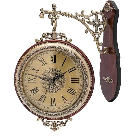 Double-sided wall clock designed for both elegance and practicality. Measuring approximately 17.7 inches tall and 14.5 inches wide. It features a 360° rotating mount that allows clear viewing from any angle. One face displays classic Roman numerals, while the other presents Arabic numerals for easy reading from a distance. Crafted from durable metal, wood, and glass.