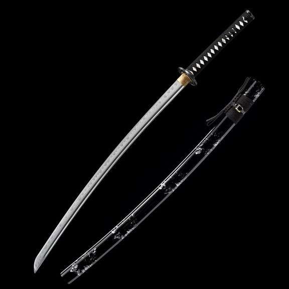 Hand-forged carbon steel traditional Japanese katana. It is a perfect balance of strength, precision, and artistry. Measuring 40 inches in total length with a 27-inch sharpened blade, it features a full tang design secured by dual bamboo pegs. The solid wood scabbard is finished in hand-lacquered layers.