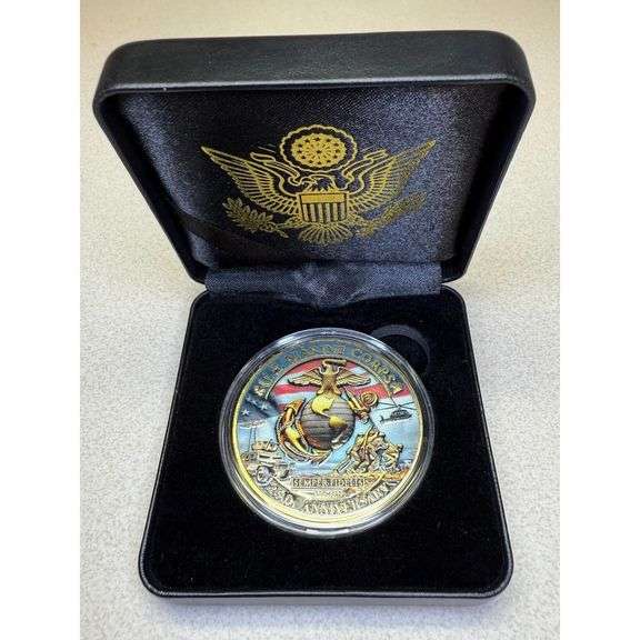 Celebrate 250 years of the United States Marine Corps with this striking commemorative challenge coin, honoring service since 1775. Made from five-metals with polished engravings. The coin has a double-sided design showcasing intricate military detail and the proud Marine motto “Semper Fidelis.” Comes in a metal gift box with a leather exterior.