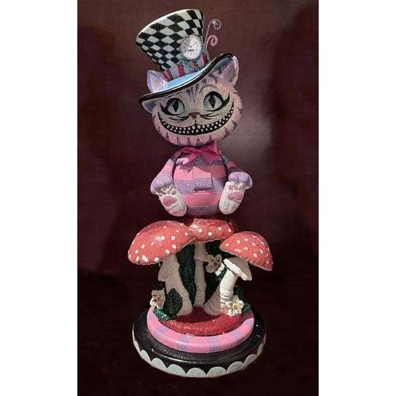A 15-inch nutcracker of Cheshire Cat inspired by Alice in Wonderland, in a colorful, stylized design, seated on a mushroom base with detailed hand-painted finishes and glitter accents.