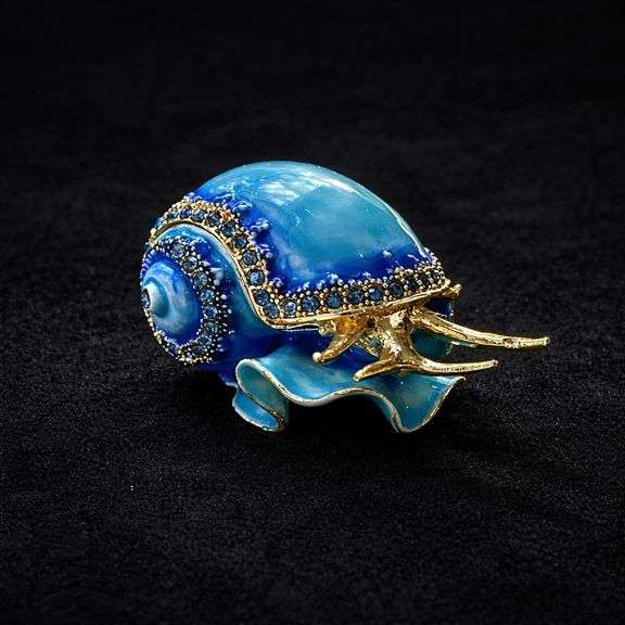 A decorative conch-shaped trinket box made from metal and finished with hand-painted enamel and set rhinestone accents. The hinged design opens to a small interior compartment suitable for holding rings, earrings, or other small keepsakes.