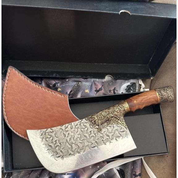 A heavy-duty cleaver with a hand-forged blade made from high carbon and manganese steel. Measuring approximately 8.4 inches long, 4 inches wide, and 0.12 inches thick. The blade is designed for chopping meat and bones. The handle is made from rosewood with brass dragon detailing.