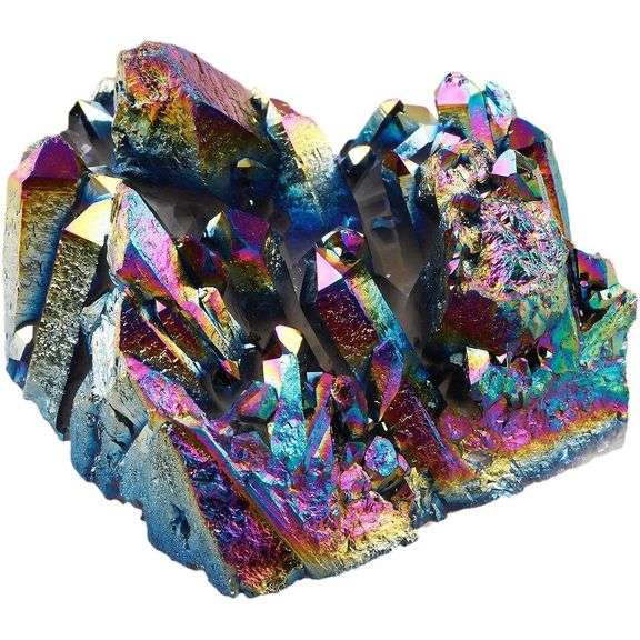 A natural quartz crystal cluster measuring approximately 1.5 to 2.2 inches treated with a titanium coating to create a multicolor “aura” surface effect. Each cluster shows natural variation in shape, surface texture, and internal inclusions, making each one different.