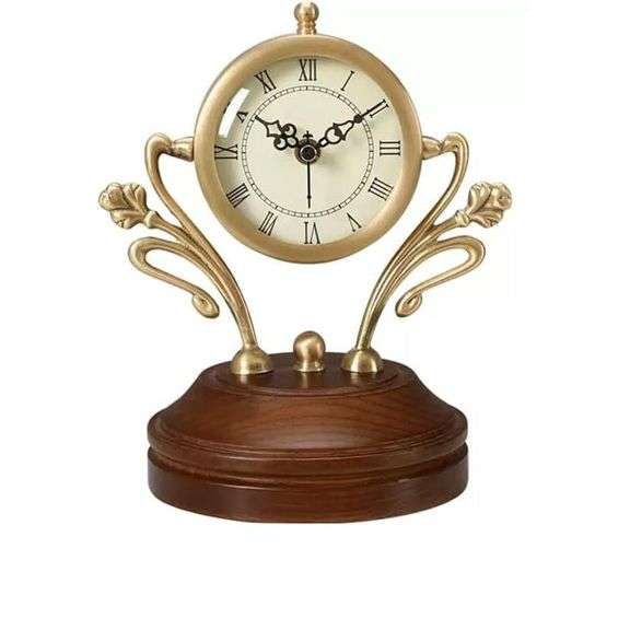 A mantel clock measuring approximately 8.6 inches high and 6.9 inches wide with a burnished metal frame with scrollwork detail mounted on a polished wood base.