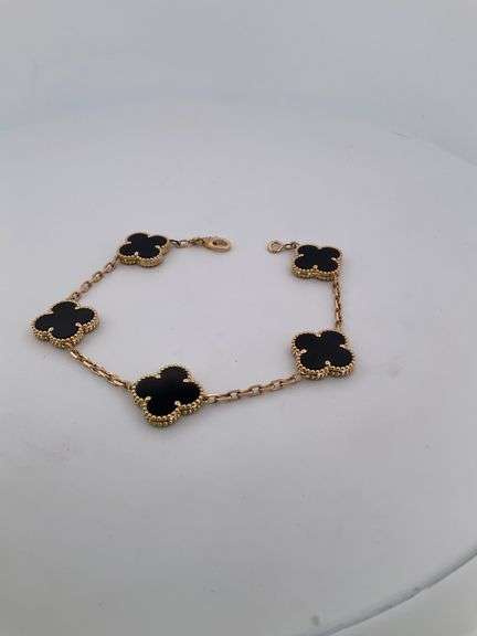 CERTIFIED 18K YELLOW GOLD LADIES BRACELET WITH ALL BLACK ONYX CLOVERS. LENGTH IS 7.5 INCHES. WIDTH IS 5/8 OF AN INCH. HAS A LOBSTER CLAW LOCK. STAMPED 18K . WEIGHT IS 11.6 GRAMS. IN MINT CONDITION. NEVER WORN. CERTIFIED BY C.G.L, CERTIFICATE #2060192076172166. CAN BE VERIFIED AT CGL-LABS.COM
