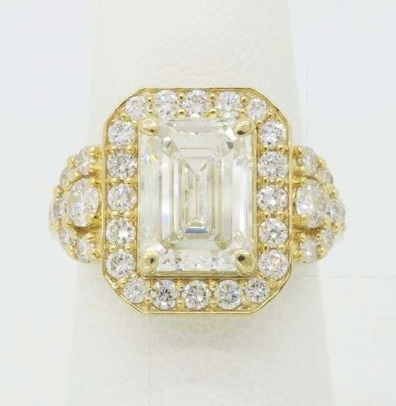 Stunning 4.59CTW Emerald Cut Diamond Halo Ring crafted in 14k Yellow Gold.