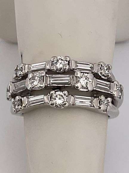 CERTIFIED LADIES PLATINUM AND DIAMOND RING / BAND. IT HAS ALL NATURAL (NOT LAB GROWN) ROUND BRILLIANT CUT AND BAGUETTE CUT DIAMONDS WITH A TOTAL WEIGHT OF 1.00 CARAT. DIAMONDS ARE E-F COLOR AND VS CLARITY. BAND IS 8.6 MM WIDE, SIZE IS 4-CAN GET RESIZED BY YOUR LOCAL JEWELER. WEIGHT IS 7.4 GRAMS OF SOLID PLATINUM. CAN BE USED AS A WEDDING BAND OR ANNIVERSARY RING. IN MINT CONDITION-NEVER WORN. CERTIFIED BY C.G.L, CERTIFICATE #2017677565160050. CAN BE VERIFIED AT CGL-LABS.COM