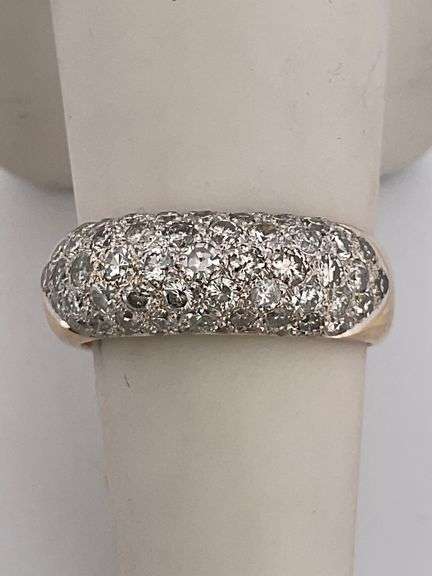This exquisite 18K yellow gold ring consisting of round brilliant and baguette cut diamonds, totaling 2.00 carats. The diamonds, securely set in pave and channel setting. The diamonds exhibit F-G color and VS1 clarity. Sized at 7, the ring can be easily resized by your local jeweler. With a total weight of 6.6 grams, this piece features earth-mined diamonds. Stamped 18K.
