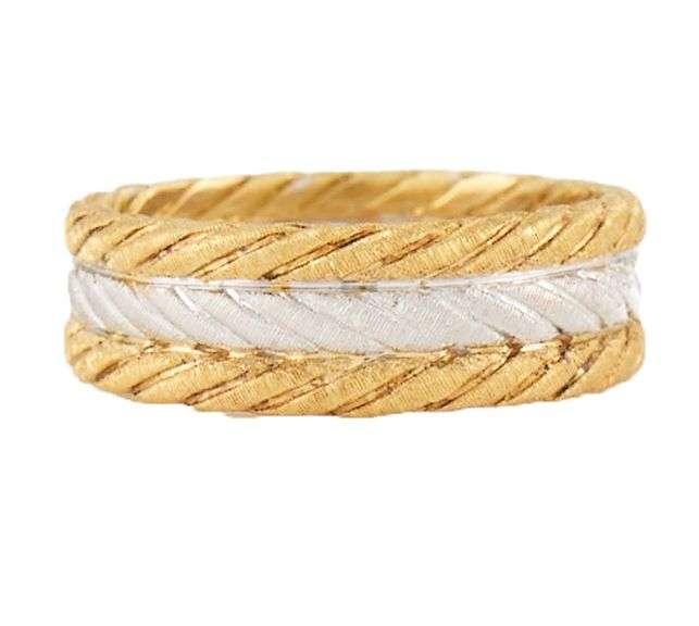 Satin Textured Braided Style Two Tone Band Ring in 18K Yellow and white gold. Band Width: Approx. 5.50 MM. Ring Size: 6.0 (US). Weight: Approx. 5.60 Grams.Stamped: 750, 1201.