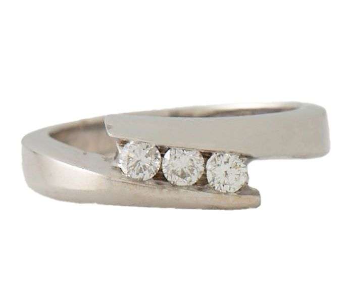 0.30ctw Round Diamond Three Stone Crossover Band Ring in 14K White gold. Clarity: SI2. Color: H – I. Ring Width: Approx. 6.20 MM (Widest Point). Ring Size: 5.75 (US). Weight: Approx. 4.80 Grams. Stamped: 14K.
