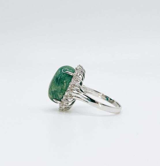 Mesmerizing Massive 12.50CTS Oval Shaped Cabochon-Cut Natural Emerald & 0.80CTW White Sapphire Ring in Sterling Silver. One mesmerizing sterling silver ring presenting an oval cabochon-cut natural Emerald center stone embellished by a halo of round cut White Sapphire accents. Total weight 7.6 grams. Size 8.