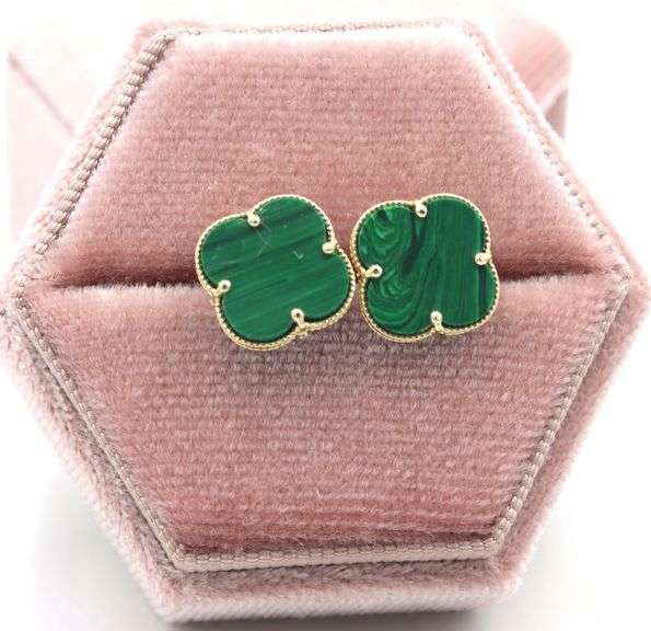 Lovely 14K Yellow Gold Malachite Motif Stud Earrings. This precious 14kt Yellow gold Malachite motif stud earrings is Inspired by Van Cleef. Total weight of earrings is 3.4 grams.