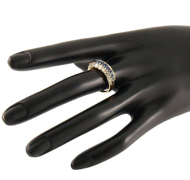 0.95ctw Diamonds and 1.00ctw Sapphire Dome Band Ring in 14K Yellow gold. Clarity: I1. Color: I – J. Sapphires Carat Weight: Approx. 1.00ctw. Band Width: Approx. 7.50 MM. Ring Size: 6.25 (US). Weight: Approx. 4.10 Grams. Stamped: 14K.