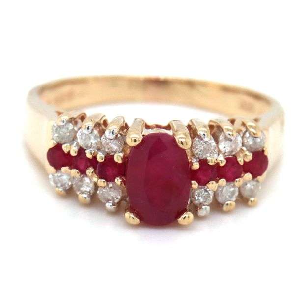 14kt Yellow gold round and oval ruby and diamond dome ring. The total weight of the ring is 3.30 grams. Ring size 5.75".