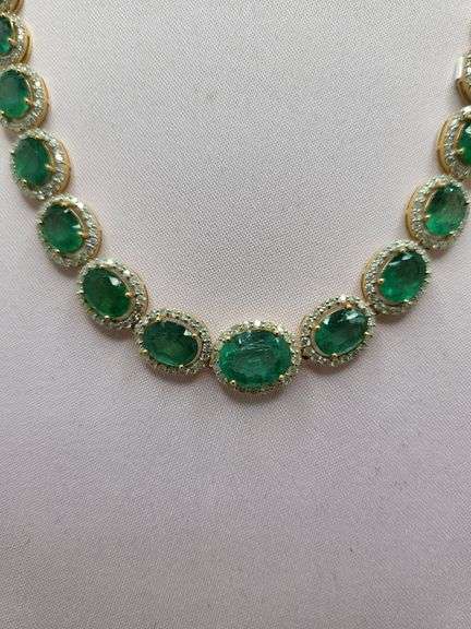 Extremely fine 32.2G of 14k gold and 30.20 ctw GGA certfied Emerald and diamond necklace. Also accompanied by a GGA , this piece has been professionally appraised for retail replacement value. Please note: the appraisal reflects retail pricing and does not represent auction or resale value