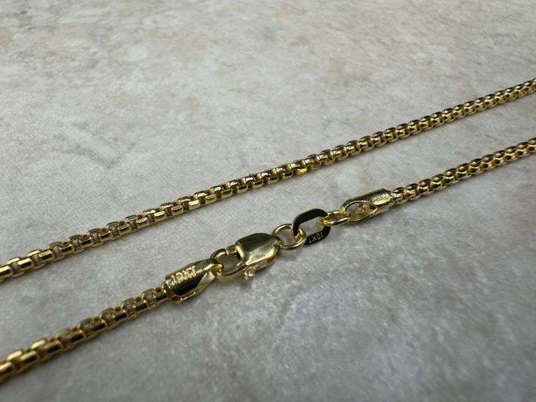 14kt Yellow gold cross pendant on 20-inch chain necklace with spring ring clasp. The total weight of the necklace is 1.2 grams.