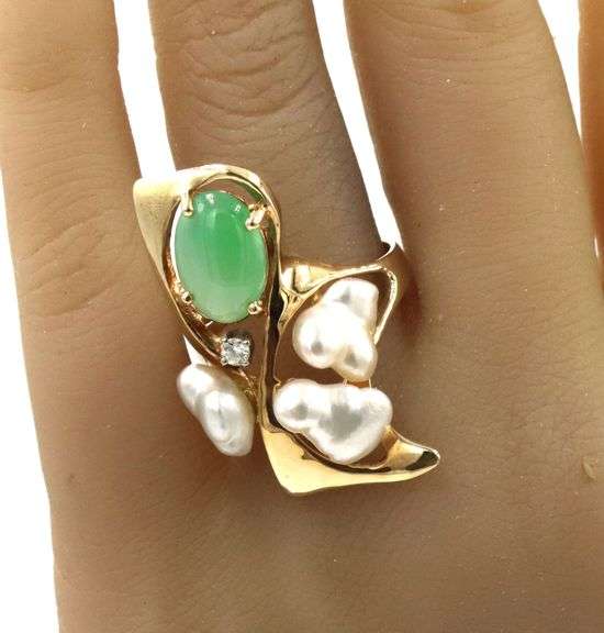 14kt Yellow gold oval Jade and freshwater pearl and diamond accent ring. The total weight of the ring is 7.70 grams. Ring size 8".
