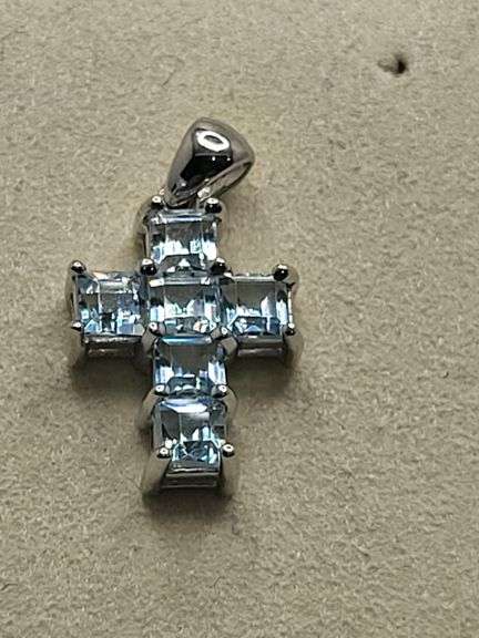Over 5ctw sky blue Topaz on 14k white gold cross pendent, 2.7gr