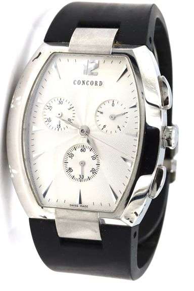 Concord La Scala chroograph quartz white dial stainless steel watch with black rubber strap. The total weight of the watch is 91.19 grams.