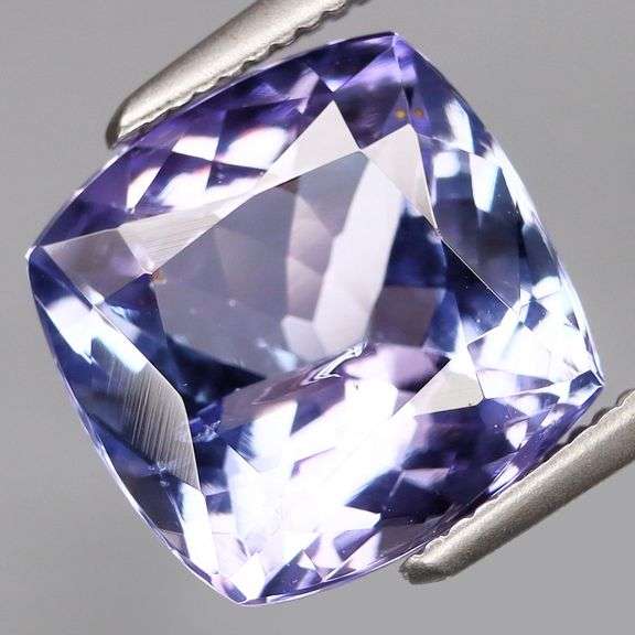 This is an eye catching example of pure Tanzanite! It has incredible size, measuring 10mm x 10mm x 5.7mm, and is filled with glittering flashing. It definitely has the three B's going for it, since it is Big, Bold, and Beautiful. The color of this piece practically glows with a gorgeous blue violet hue that shows traces of silver and pink in its brilliant flashing, with light to medium saturation and a strong tone through SI clarity. And the cut! The tight overlapping faceting of this tanzanite elevates its cushion cut into a sparkle generating machine giving you abundant light return under a premium polished luster that glitters over every surface. And although heating is the preferred treatment for tanzanite, this collectors piece is all natural with no treatment. It is absolutely stunning. Don't miss this vibrant gemstone! Sourced from Tanzania.
