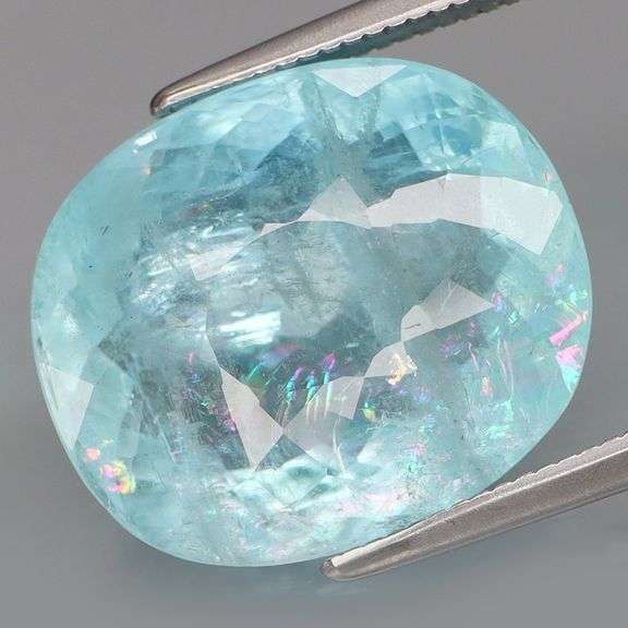 This very large aquamarine measures a whopping 14.7mm x 12.5mm x 7.8mm, and exhibits a stunning sky blue hue with light saturation. A mix of glittering and liquid flashing frames its table, but the real star of the show is what's on the inside. This aquamarine has a large feather in it that refracts the light, giving it a large swath of rainbow colors suspended under its surface. The prismatic effect is strong, and is easily observed through movement. Sourced from Brazil. Untreated!!!