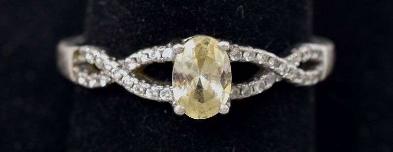 CZ Ring with Small Accent Stones in Sterling Silver 3grams Size 10 3/4. This adorable sterling silver ring displays an oval cut yellow CZ gemstone in a prong setting adorned with a split band design mounted with round cut white CZ gemstones pronged on each shoulder. The size of this ring is 10 3/4. Total weight is 3 grams.
