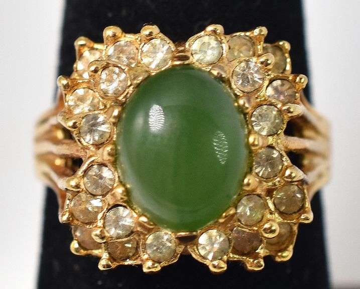 Jadeite and CZ Gemstone Ring in Vermeil Sterling Silver. 7g, Size 6 3/4.