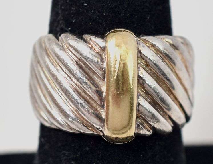Wide Band Ring with 18k Gold accent in Sterling Silver 15.6grams Size 6 3/4. This wonderful sterling silver ring displays a twist like design adorned with 18K yellow gold accent in the center. The size of this ring is 6 3/4. Total weight is 15.6 grams.