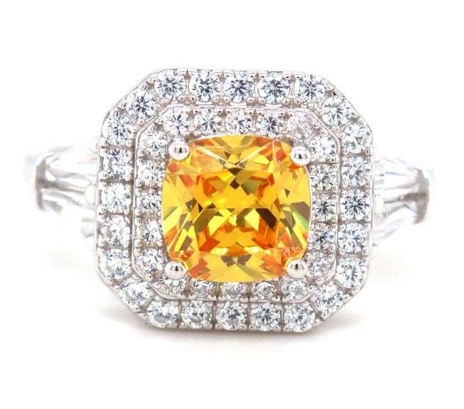 925 Sterling silver princess cut yellow and white round and baguette cubic zirconia ring. The total weight of the ring is 4.6 grams. Ring size 8".