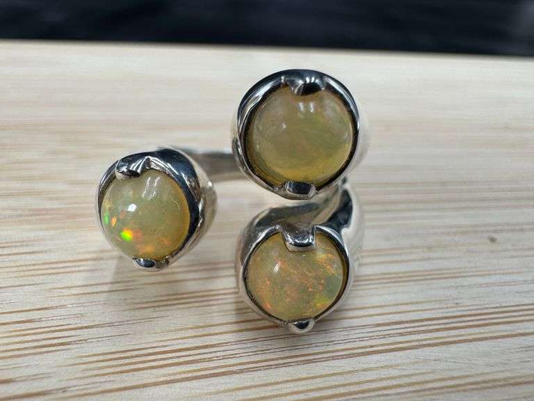 Opal and CZ Gemstone Ring in Sterling Silver. This is adorable sterling silver ring displays round cabochon opal gemstones in a flower prong setting adorned with round cut CZ gemstones in a prong setting. The size of this ring is 9 1/2. Total weight is 2.7 grams.