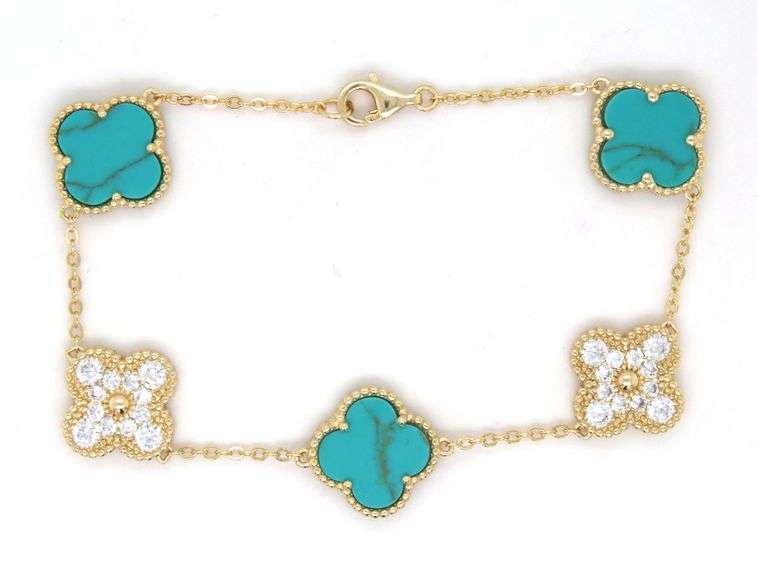 925 Sterling silver 12mm turquoise and cubic zirconia clover link 7.25-inch bracelet with lobster clasp. The total weight of the bracelet is 8.9 grams.