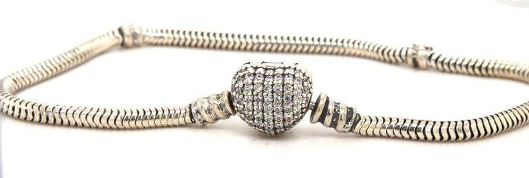 925 Sterling silver pandora style 9-inch bracelet with cubic zirconia heart shaped clasp. The total weight of the bracelet is 13 grams.