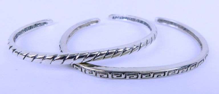 Sterling silver cuffs with Greek Key and Ribbed designs. 4MM wide each, 2.5" inside diameter, fits average wrist. Signed & hallmarked.
