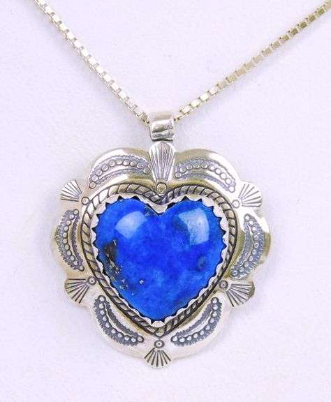 Southwest/Navajo design, lapis heart pendant is 15/16" x 3/4", suspended on an 18" sterling chain. Incised Q.T. 925.