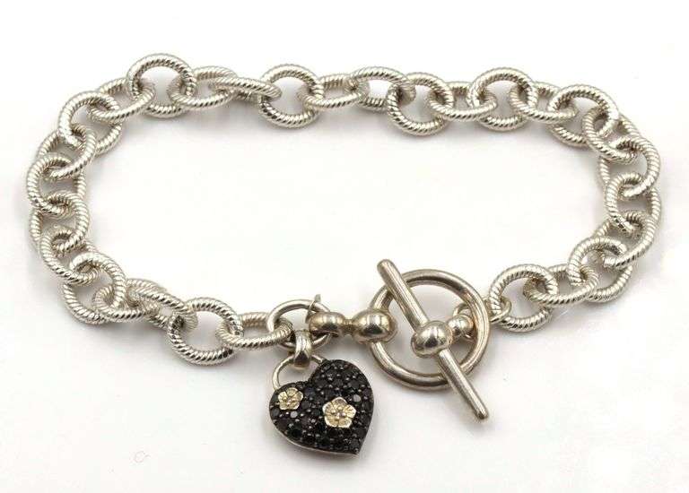 925 sterling silver Stephen Dweck black diamond heart charm bracelet with toggle. 22.2Grams