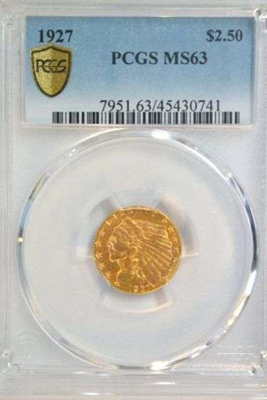 Vibrant mint luster on this Choice Brilliant Uncirculated 1927 $2.50 Indian Gold Piece that's in a PCGS MS 63 holder.